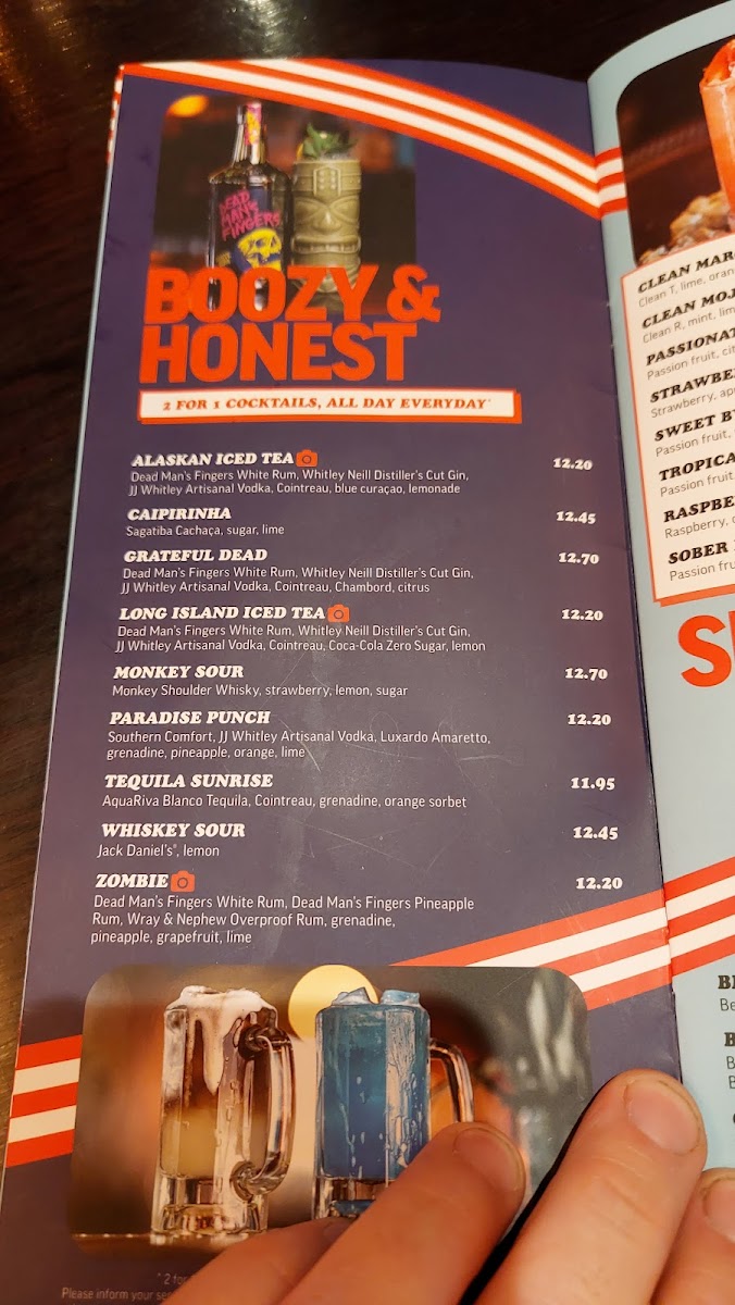 Dead Man's Fingers spiced rum, amaretto, AquaRiva Blanco tequila, blue curaçao with passion fruit, apple and grapefruit juices.